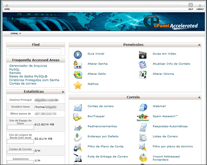 Informações da conta: Ao acessar seu painel de controle, você já terá acesso a todas as informações de sua conta: quanto espaço da conta você está usando, subdomínios, bancos de dados, recursos de e-mail, contas de FTP, tráfego de dados, etc.